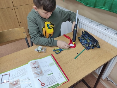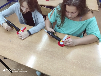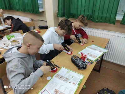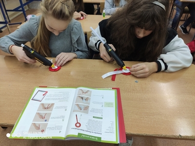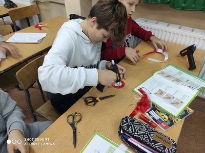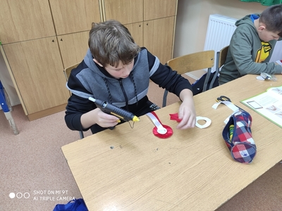 Na poczatku listopada uczniowie klasy VI na lekcjach techniki wykonywali pracę praktyczną "Ozdoba Narodowa". Wykonanie tej pracy polegającej na łączeniu elementów zaczepowych do ww. ozdoby było możliwe dzięki pistoletom na klej na gorąco zakupionym w ramach Programu #LaboratoriaPrzyszłości
