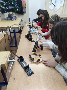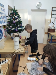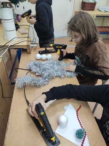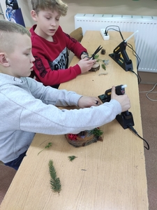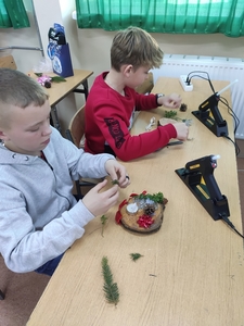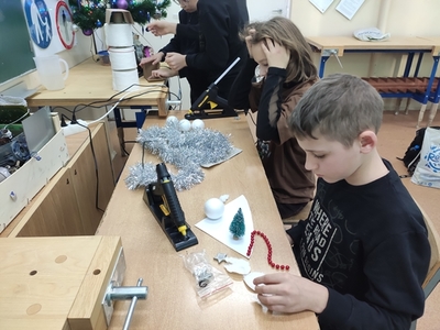 Pod koniec grudnia uczniowie klasy V i VI na lekcjach plastyki wykonywali pracę plastyczną "Ozdoba bożonarodzeniowa". Wykonanie tej pracy polegającej na łączeniu elementów dekoracyjnych do ww. ozdoby (stroika świątecznego) było możliwe dzięki pistoletom na klej na gorąco zakupionym w ramach Programu #LaboratoriaPrzyszłości