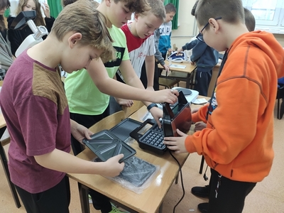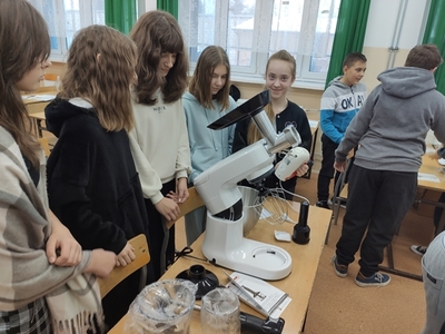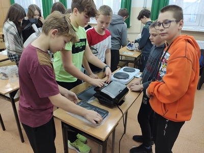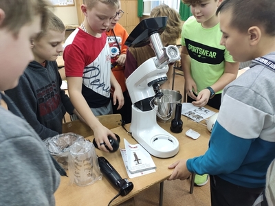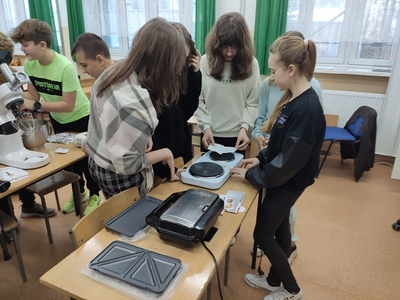 W miesiącu styczniu 2023 r. uczniowie klas VI na lekcji techniki poznawali sprzęt gospodarstwa domowego i jego zasadę działania. Między innymi były to: robot wieloczynnościowy, mikser, blender, gofrownice- tostery- opiekacze 3w1, żelazko, kuchenka elektryczna, itp. Praktyczne poznawanie tego sprzętu możliwe było dzięki zakupom ww. sprzętu dokonanym w ramach Programu #LaboratoriaPrzyszłości