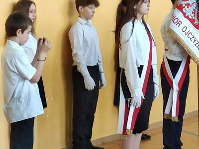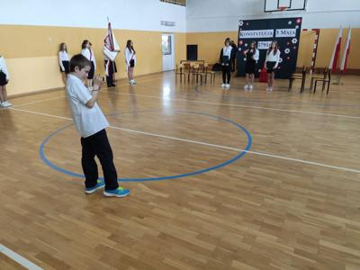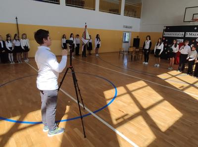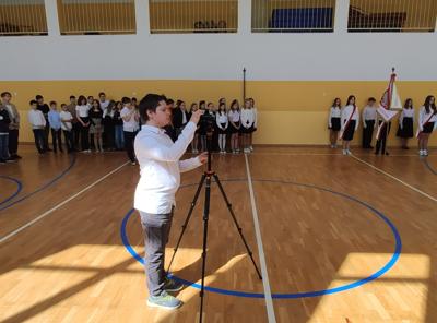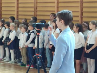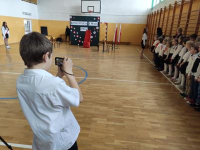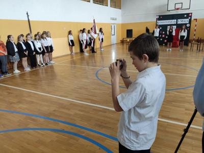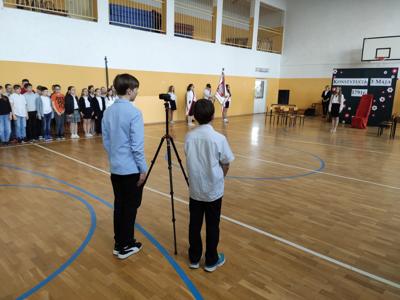 28 kwietnia 2023 r. w trakcie obchodów w naszej szkole "Święta Konstytucji 3 Maja" uczniowie klasy VII mieli możliwość doskonalić tajniki fotografii i filmu. Korzystali z aparatu fotograficznego oraz kamery ze statywem, poznając w praktyce zasady działania tego sprzętu. Uwiecznili oni na zdjęciach oraz nakręconym filmie przebieg ww. uroczystości szkolnej, w tym występy swoich młodszych kolegów. Praktyczne działanie uczniów klasy VII, które ilustrują zdjęcia możliwe były dzięki zakupionemu sprzętowi w ramach Programu #LaboratoriaPrzyszłości