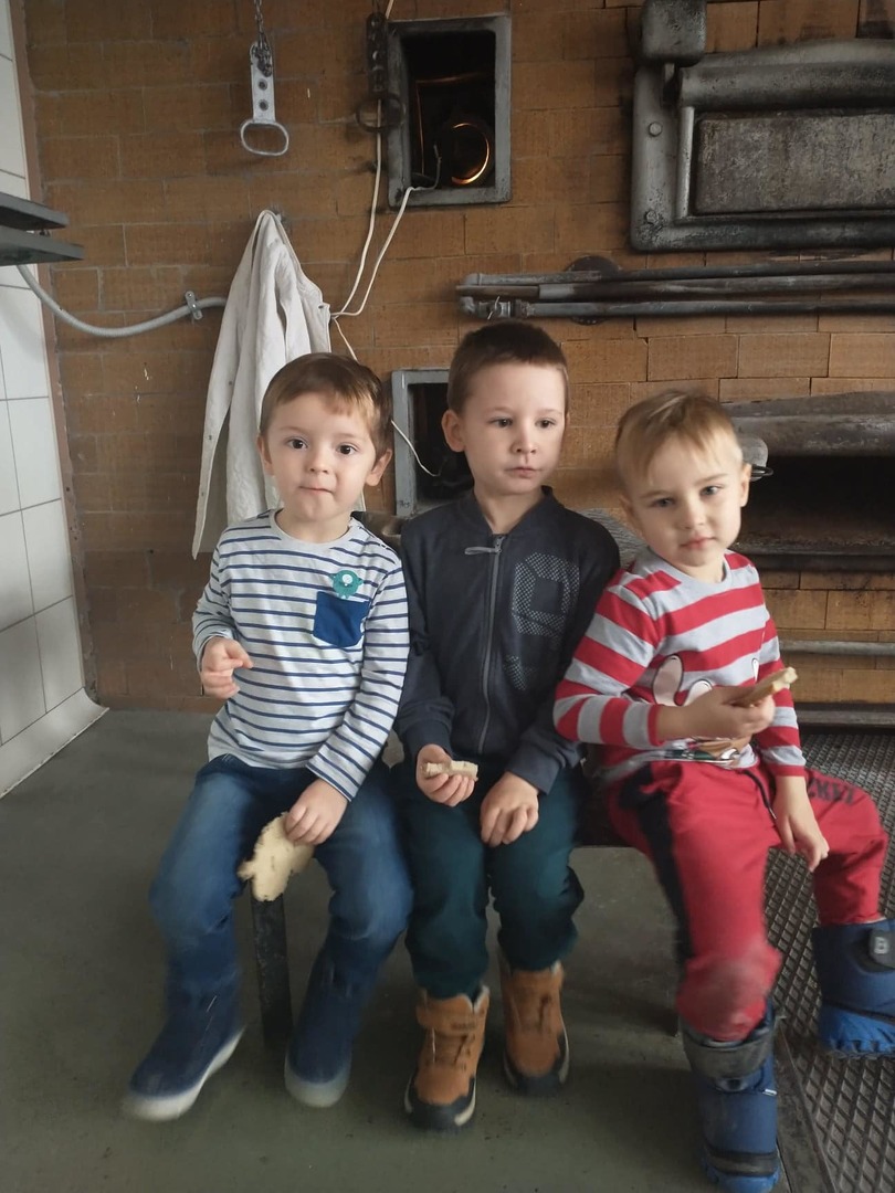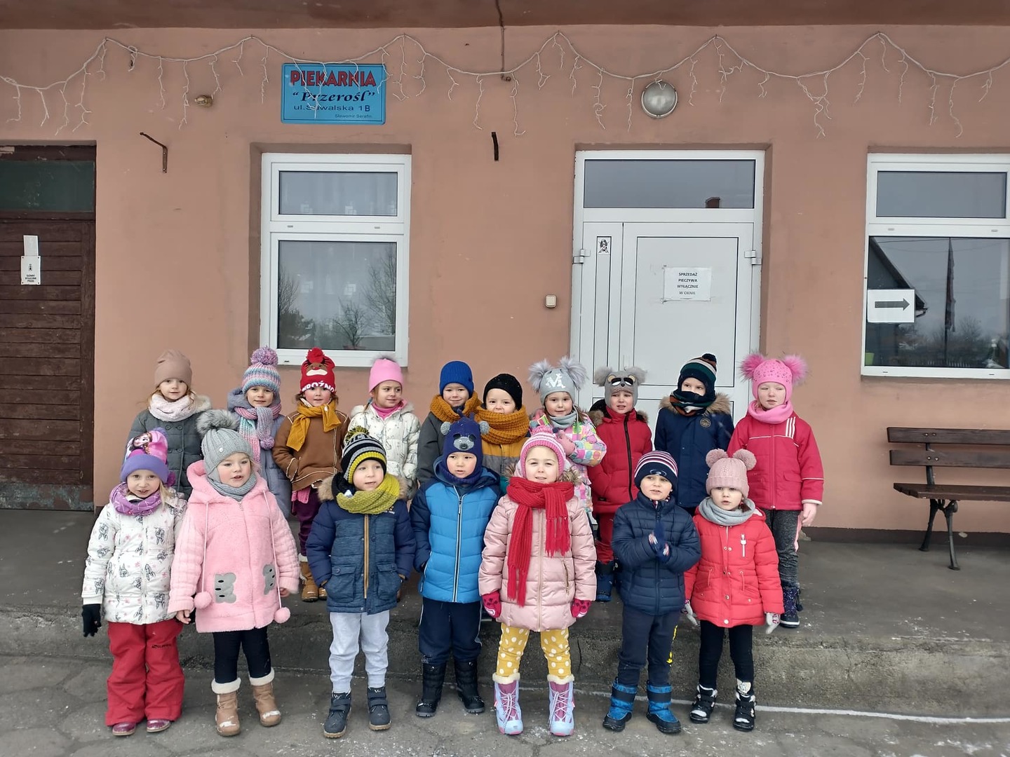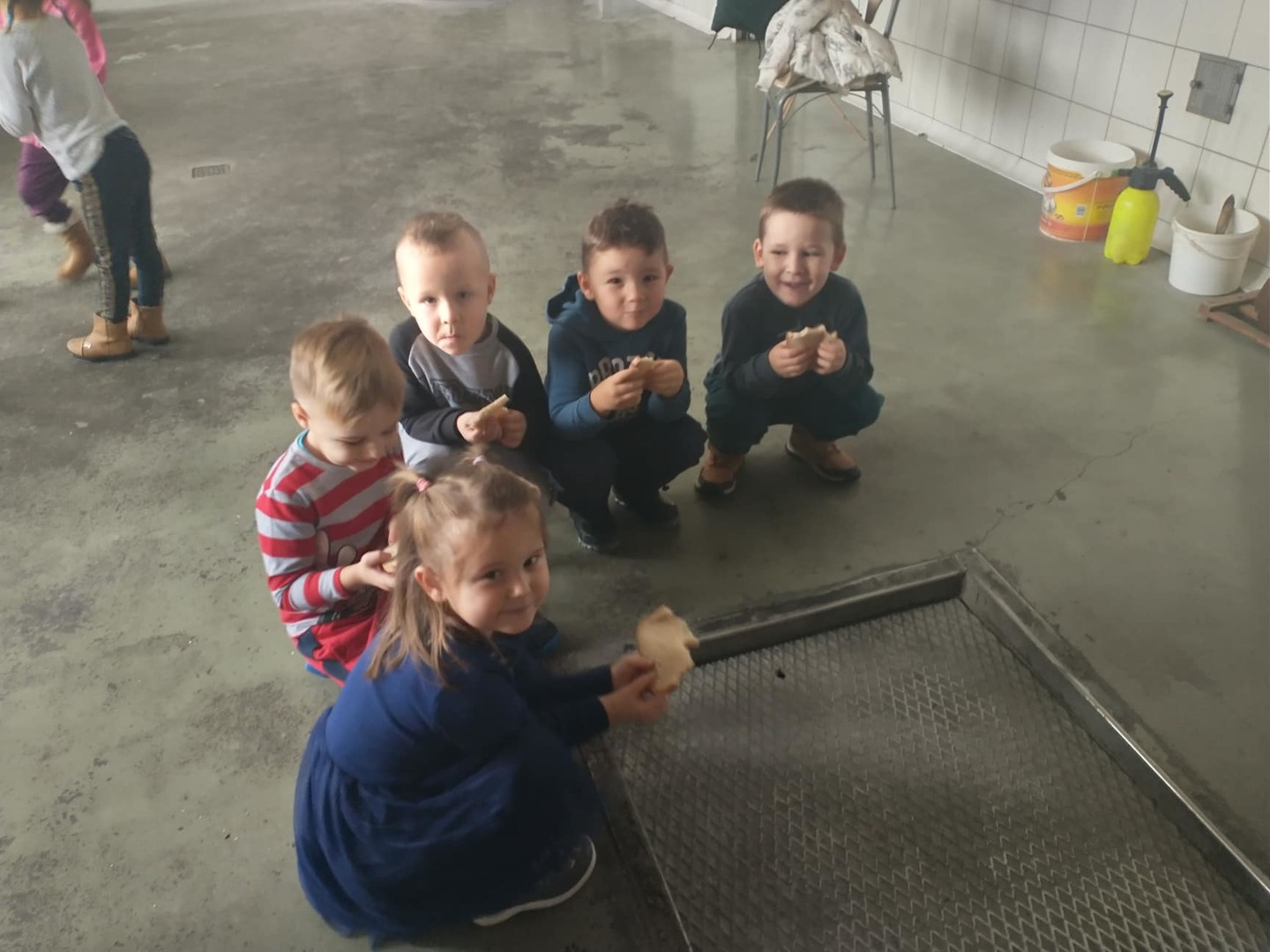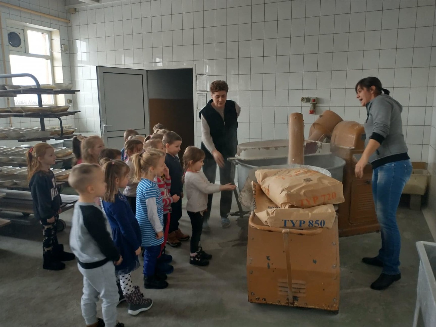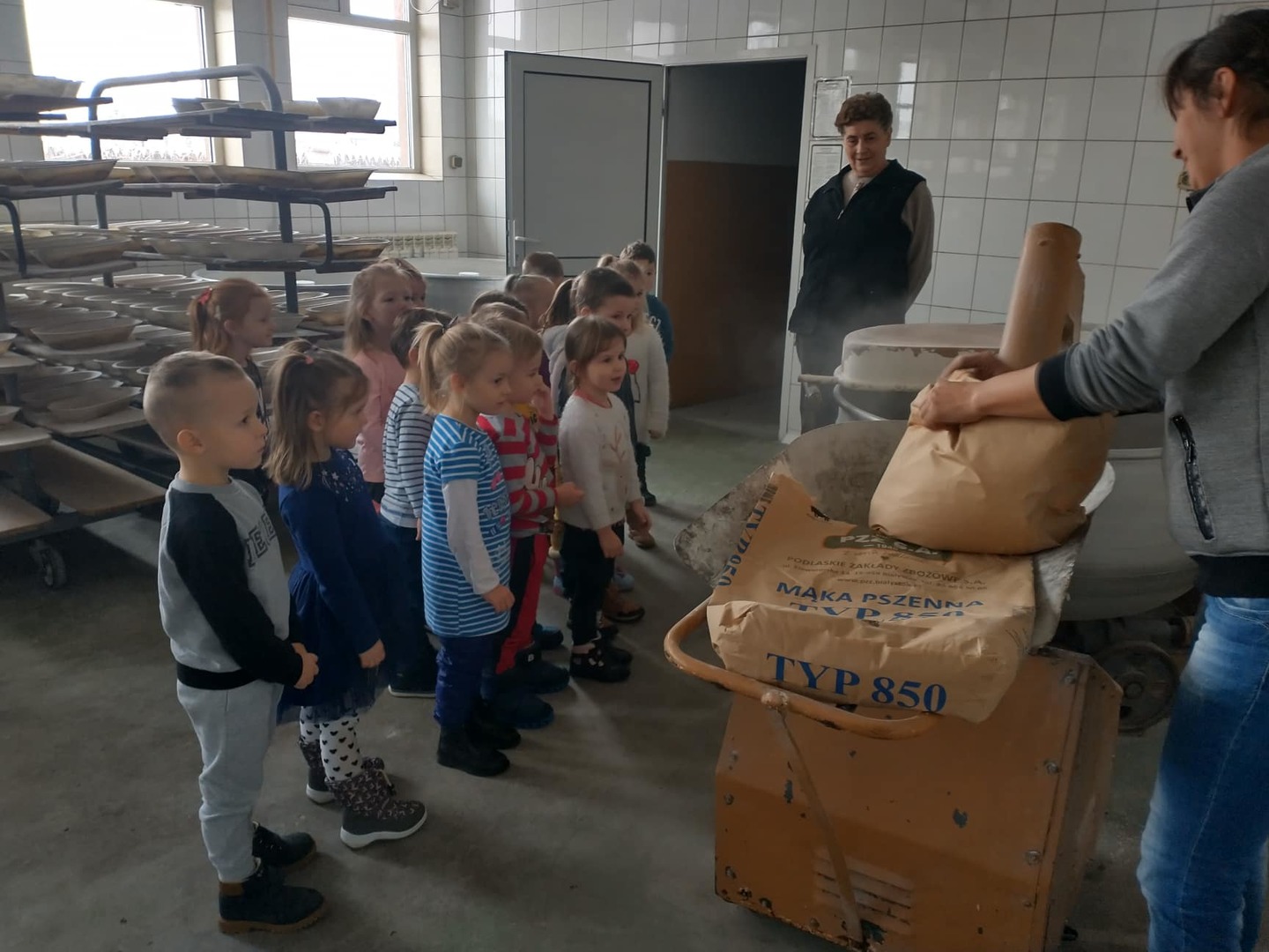 W dniu 7 grudnia grupa 4-latków udała się z wizytą do piekarni. Celem wycieczki było poznanie pracy piekarza, kształtowanie kultury zachowania oraz integracja grupy. Podczas pobytu w piekarni dzieci zwiedzały pomieszczenia znajdujące się w budynku, poznały urządzenia potrzebne do procesu wyrobienia i wypiekania chleba, rozmawiały z piekarzem i zapoznały się z poszczególnymi fazami pieczenia chleba. Przedszkolaki dowiedziały się również jak ważne w pracy piekarza jest bezpieczeństwo i higiena pracy. Największe zainteresowanie wzbudził ogromny piec opalany węglem. Dzieci dowiedziały się, w jakiej temperaturze i w jakim czasie pieczony jest chleb. Na koniec grupa 4-latków została poczęstowana pysznym chlebem. Wizyta w piekarni bardzo podobała się dzieciom.