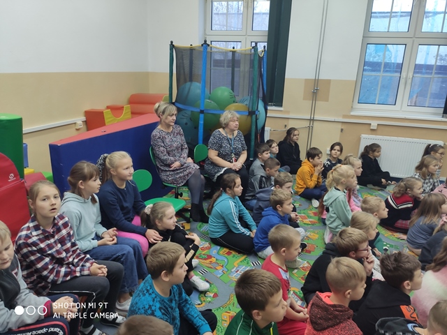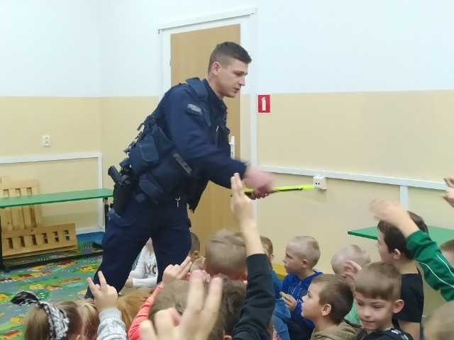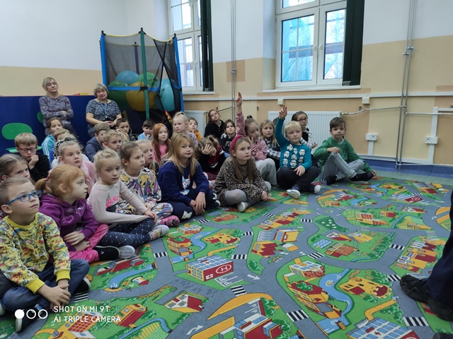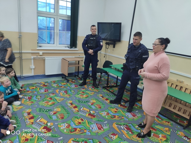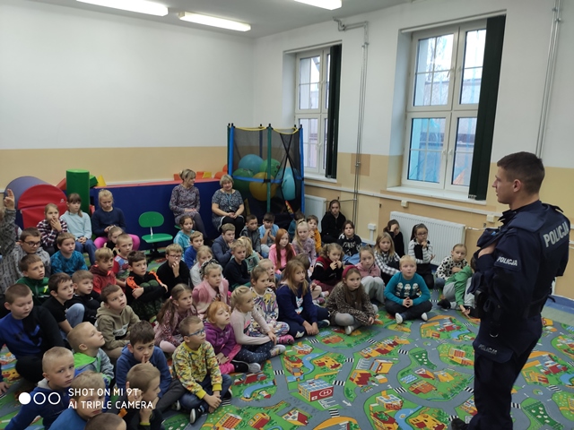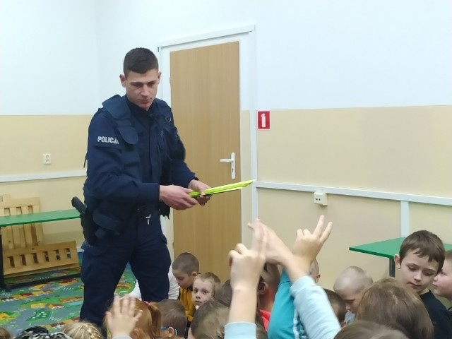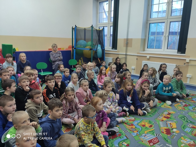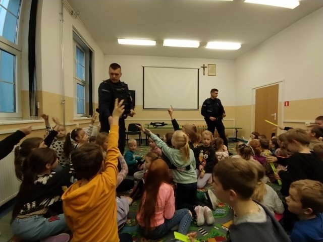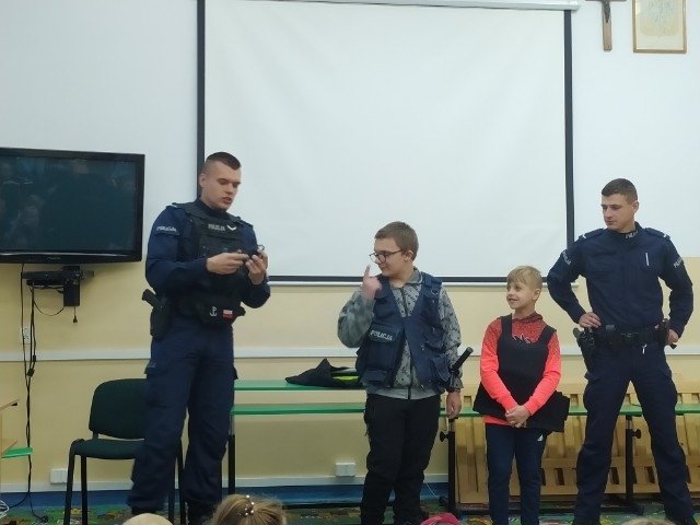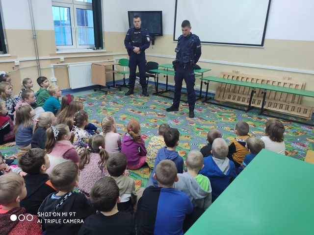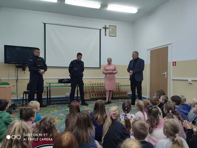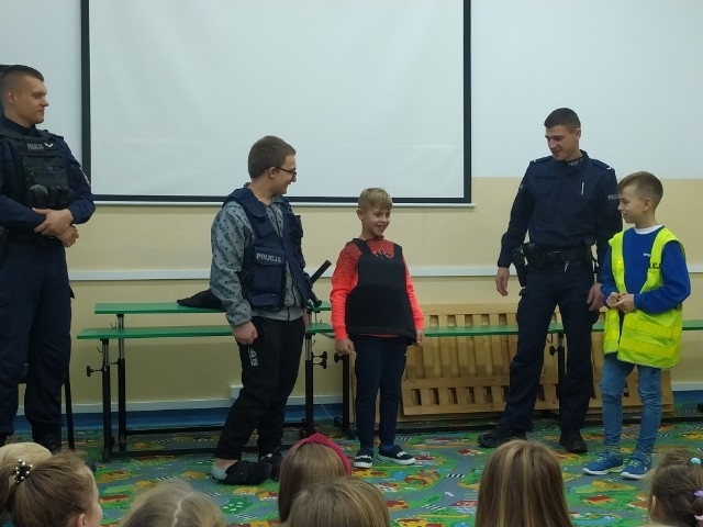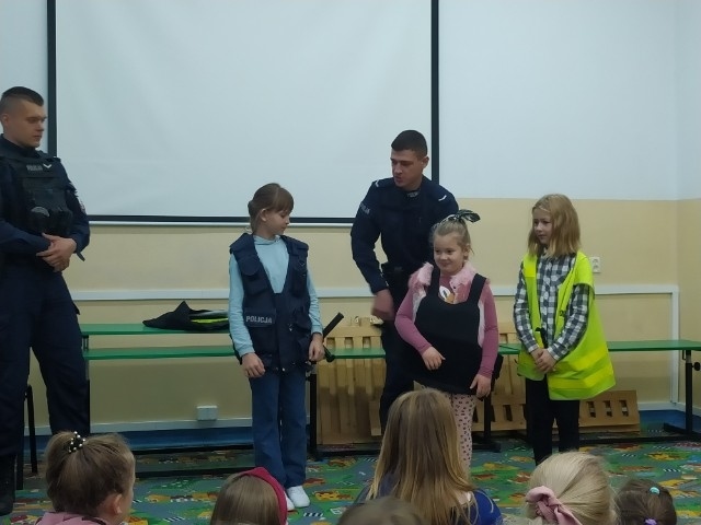 Pod tym hasłem w dniu 26 października odbyło się spotkanie dla uczniów klas I – III naszej szkoły. Gościliśmy policjantów z Komendy Policji w Suwałkach na co dzień pracujących na Posterunku w Filipowie. Spotkanie rozpoczęła p. Dyrektor Iwona Galińska, która przywitała gości i naszych najmłodszych uczniów. Podczas spotkania uczniowie mieli okazję przypomnieć podstawowe zasady obowiązujące pieszych w ruchu drogowym. Uczniowie chętnie uczestniczyli w tych zajęciach, z zaangażowaniem udzielali odpowiedzi na wiele pytań związanych z bezpieczeństwem, wskazywali różne zagrożenia, przypomnieli znaki drogowe oraz zasady poruszania się zarówno w terenie zabudowanym jak i poza nim. Policjanci przekazali uczniom elementy odblaskowe, dzięki którym będą bardziej widoczni dla innych uczestników ruchu. Atrakcją był pokaz kamizelek policyjnych, które uczniowie mogli przymierzyć oraz innego wyposażenia. Spotkanie zorganizował szkolny koordynator bezpieczeństwa p. S. Małachowski.