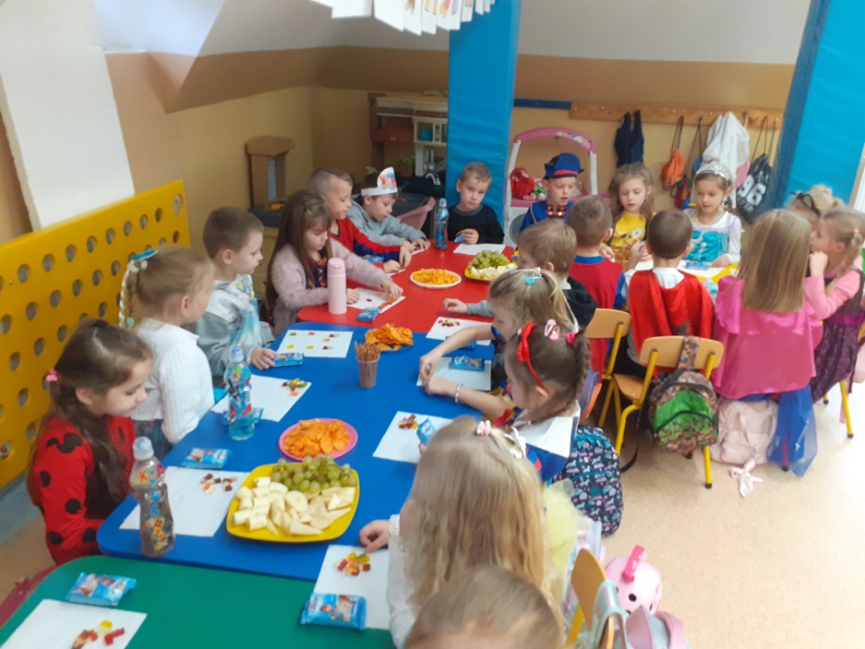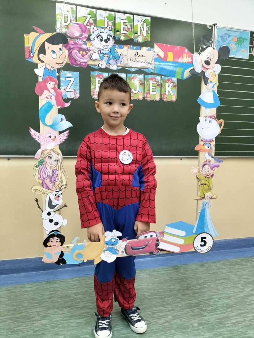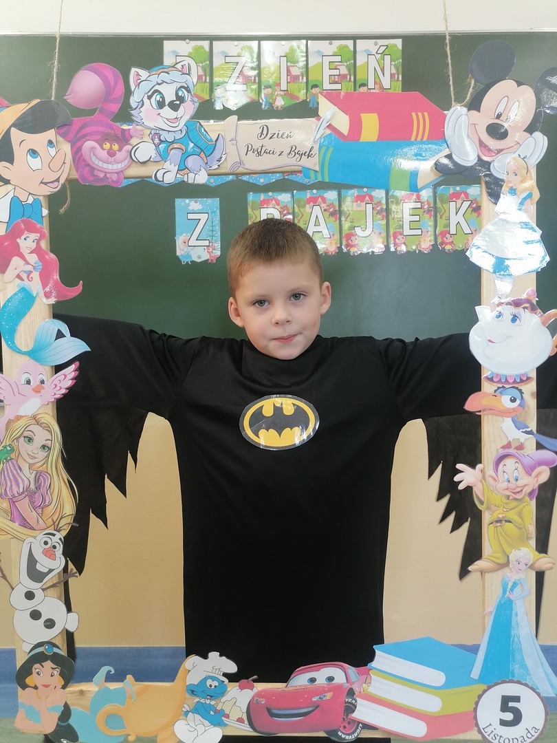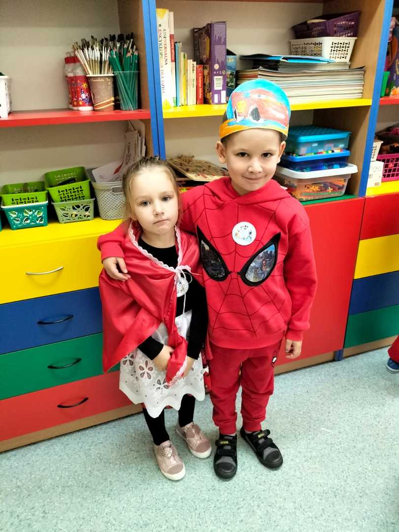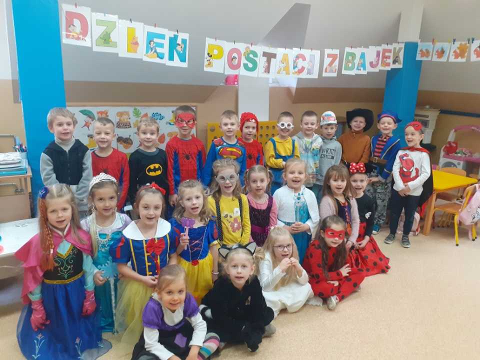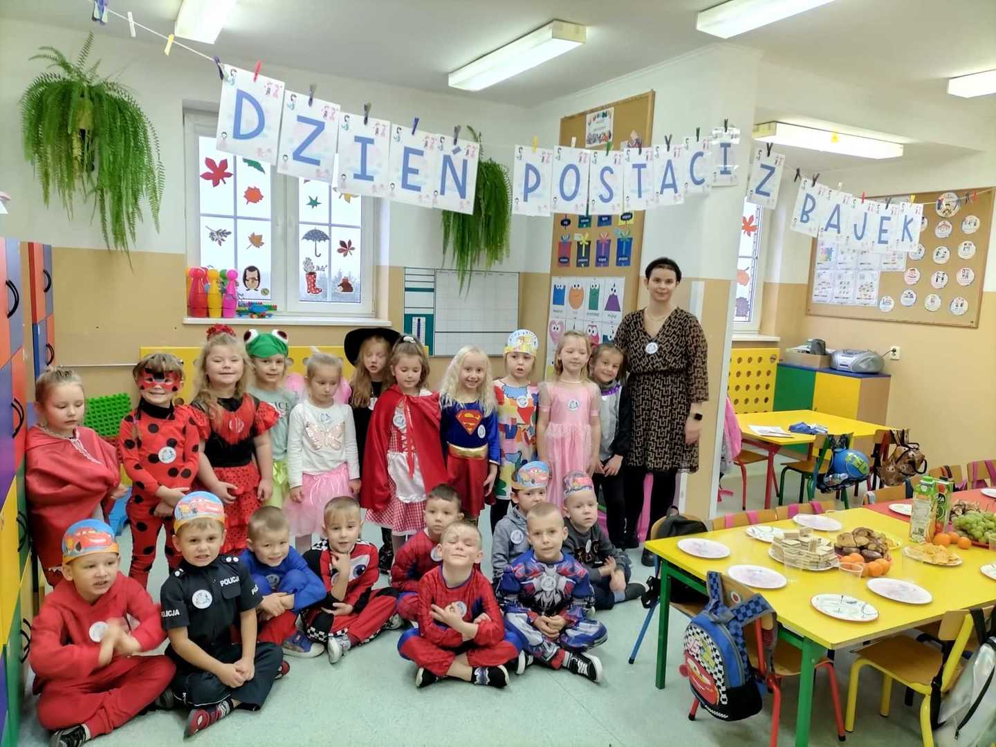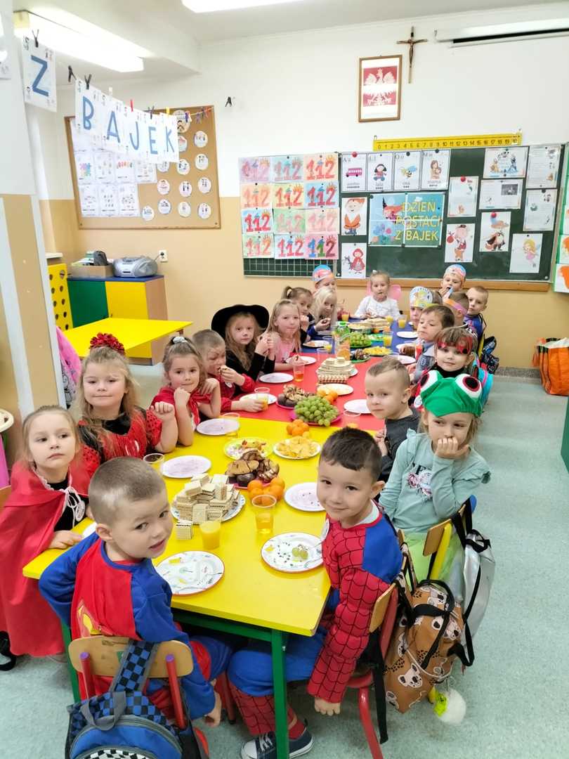 Z okazji Międzynarodowego Dnia Postaci z Bajek dn. 7.11.2022r. dzieci z oddziałów przedszkolnych przybyły do przedszkola przebrane w piękne bajkowe stroje. Nie zabrakło: Księżniczek, Spider-Mana, Batmana, piesków z Psiego Patrolu, Czerwonego Kapturka i wielu innych bajkowych postaci. Dzieci zaprezentowały swoje stroje podczas wspólnych tańców i zabaw. Z każdej grupy zostały nagrodzone po dwa najciekawsze stroje. Przedszkolacy rozpoznawali bajki po przeczytanym fragmencie , rozpoznawały również bajkowe postacie i tytuły bajek po rekwizytach oraz układały bajkowe puzzle. Nie zabrakło również słodkiego poczęstunku niczym z „Chatki Baby Jagi”. Na koniec bajkowego, pełnego radości i dobrej zabawy dnia, dzieci zrobiły pamiątkowe zdjęcie w bajecznej fotoramce.