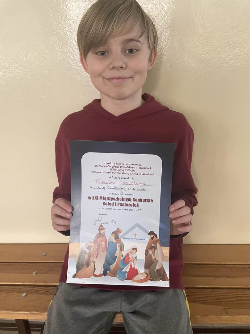Nasi uczniowie zdobyli wysokie miejsca w Międzyszkolnym Konkursie Kolęd i Pastorałek w Wiżajnach. Blażej i Julia, jak też inni uczestnicy, zostali przygotowani przez p. Ewę Staniszewską, D. Dobrzyń, I. Darmetko, T. Pietkiewicz oraz D. Lejmel. Gratulujemy serdecznie i życzymy kolejnych sukcesów!