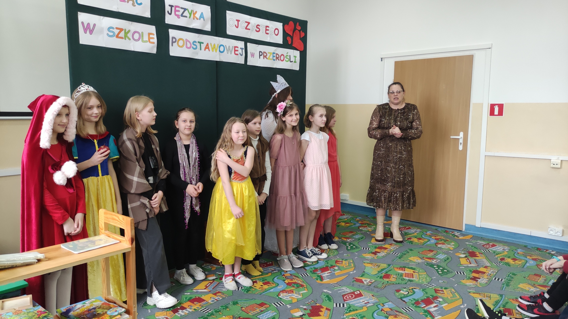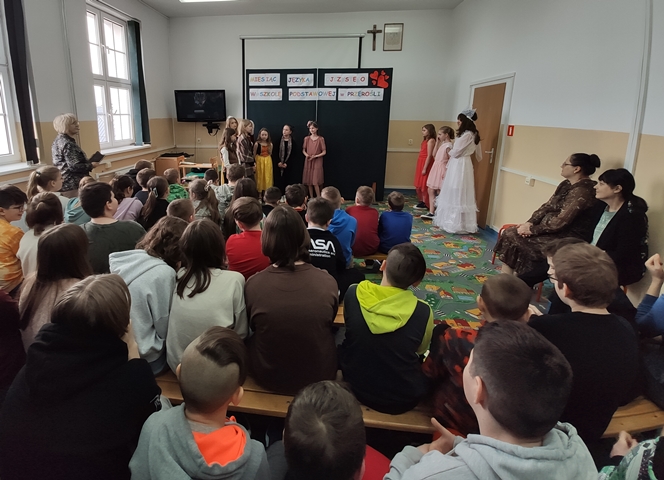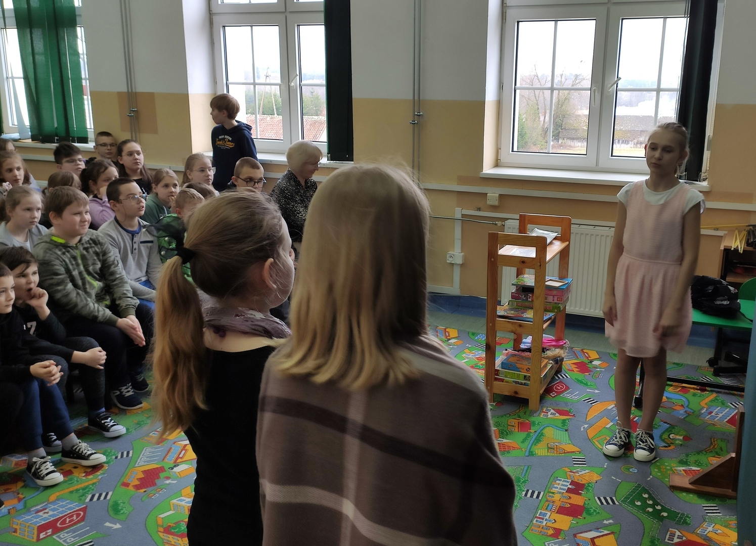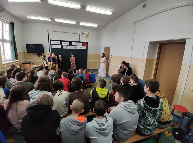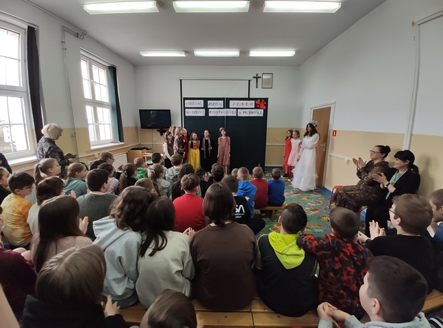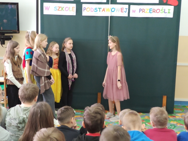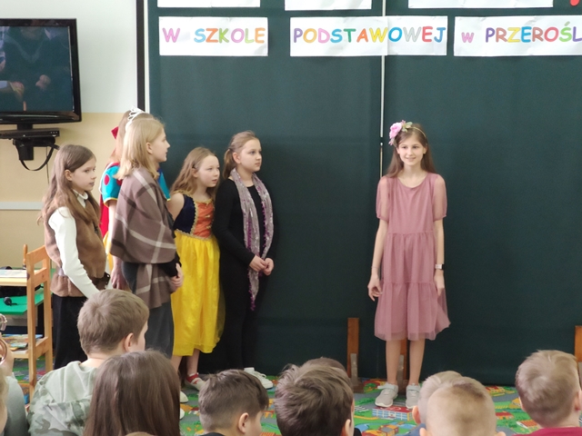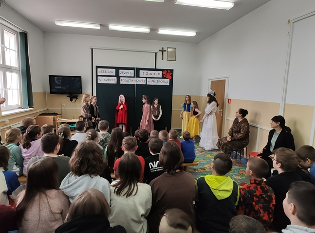 Podsumowaniem naszych konkursowych spotkań z językiem polskim było przedstawienie pt. „W bibliotece”, w którym wystąpiły uczennice klasy IV i VI. Akcja tej krótkiej sztuki działa się w bibliotece, a jej treść miała zachęcać do aktywnego czytelnictwa i częstego sięgania po książki. Sądząc po reakcji widowni, przedstawienie się podobało! Dziewczęta do występu przygotowała p. A. Małachowska wspierana przez p. J. Staśkiewicz.