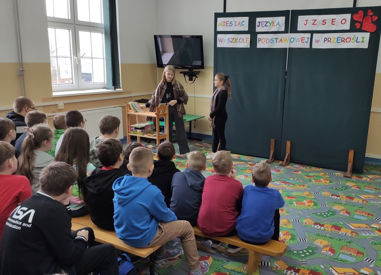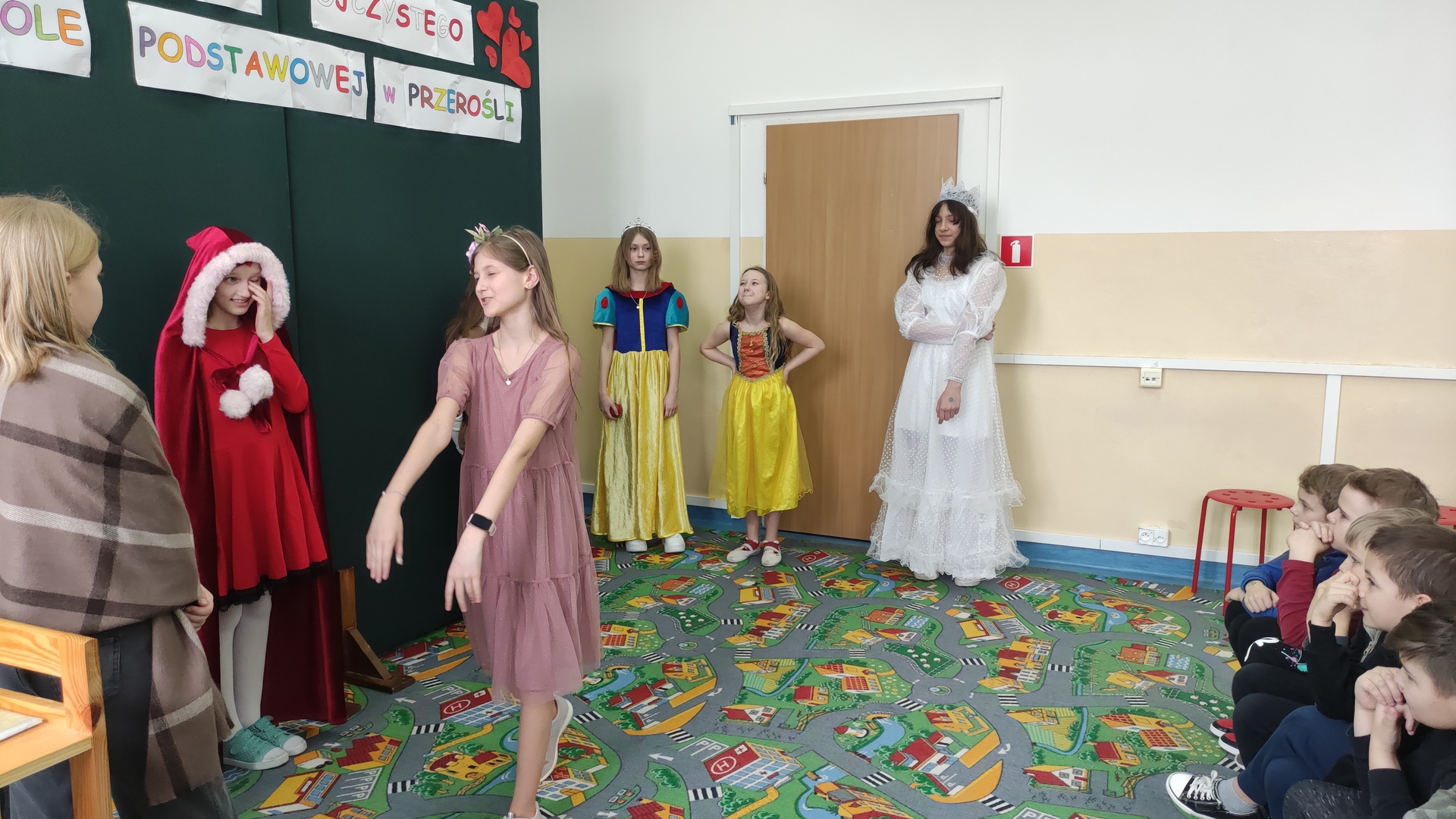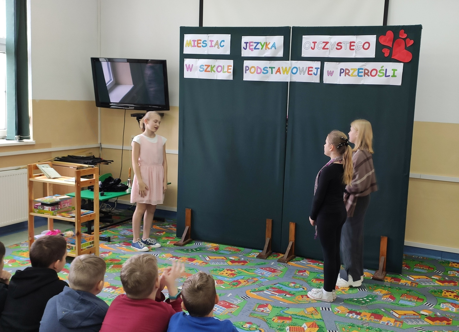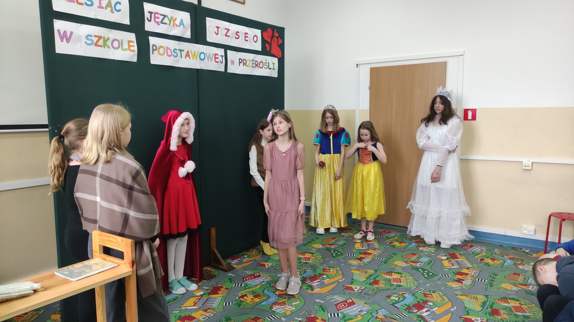 Podsumowaniem naszych konkursowych spotkań z językiem polskim było przedstawienie pt. „W bibliotece”, w którym wystąpiły uczennice klasy IV i VI. Akcja tej krótkiej sztuki działa się w bibliotece, a jej treść miała zachęcać do aktywnego czytelnictwa i częstego sięgania po książki. Sądząc po reakcji widowni, przedstawienie się podobało! Dziewczęta do występu przygotowała p. A. Małachowska wspierana przez p. J. Staśkiewicz.