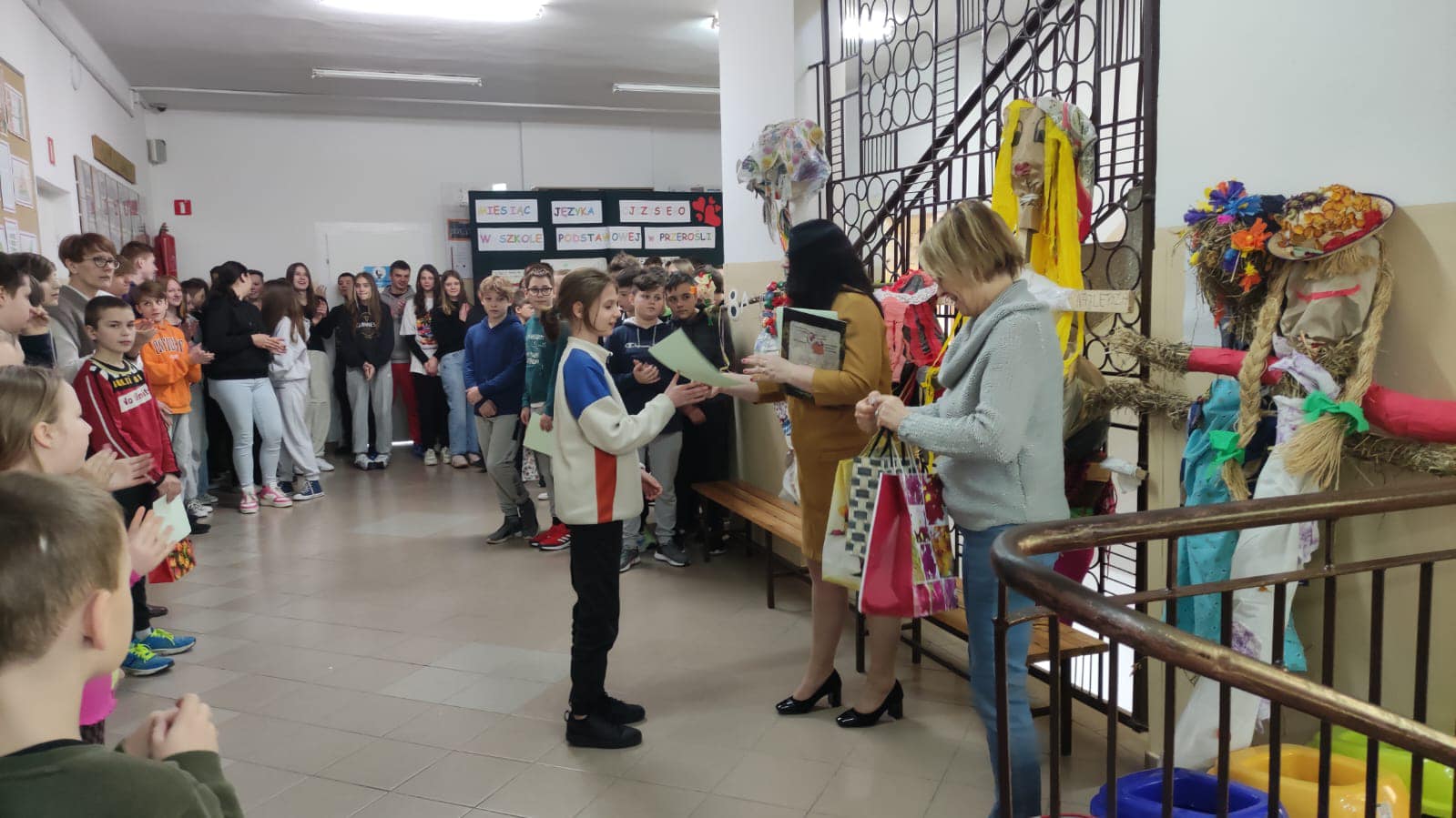 Podsumowanie konkursu na najładniejszą Marzannę. I miejsce 8a, II - 8b i 4, III - kl. 5, IV - 6 kl., V miejsce kl. 7. Nagrody zakupione z funduszy Samorządu Uczniowskiego SP w Przerośli.(D.Dobrzyń)