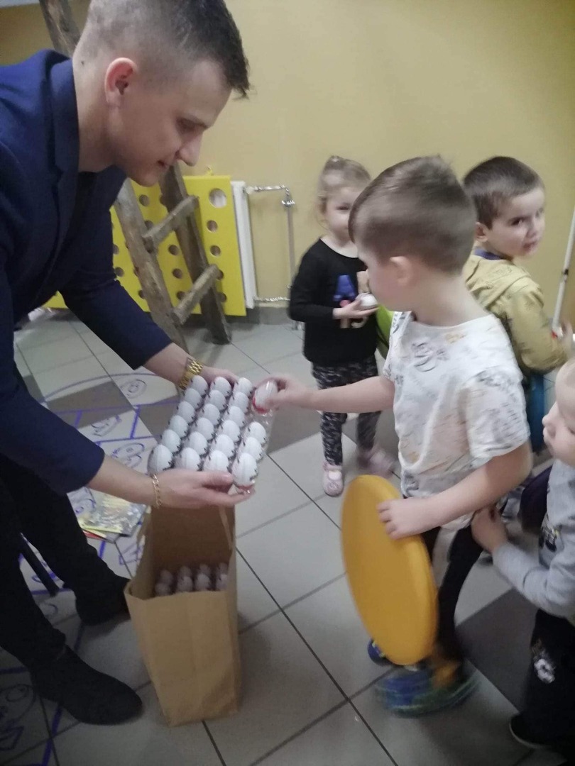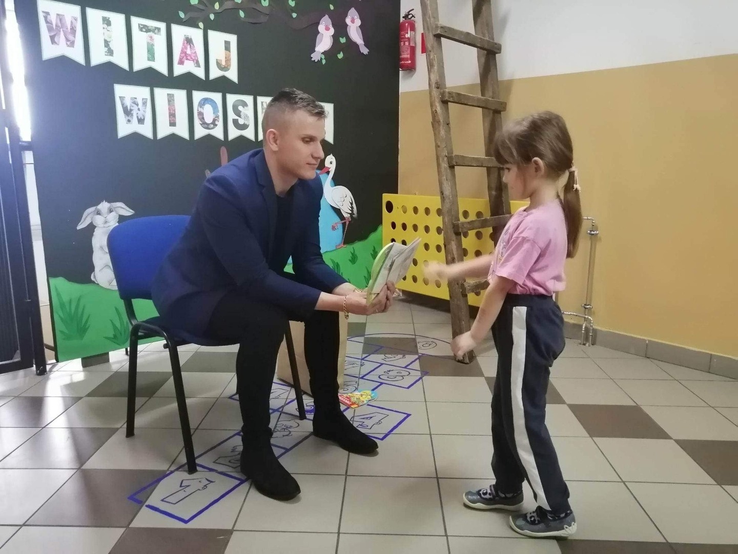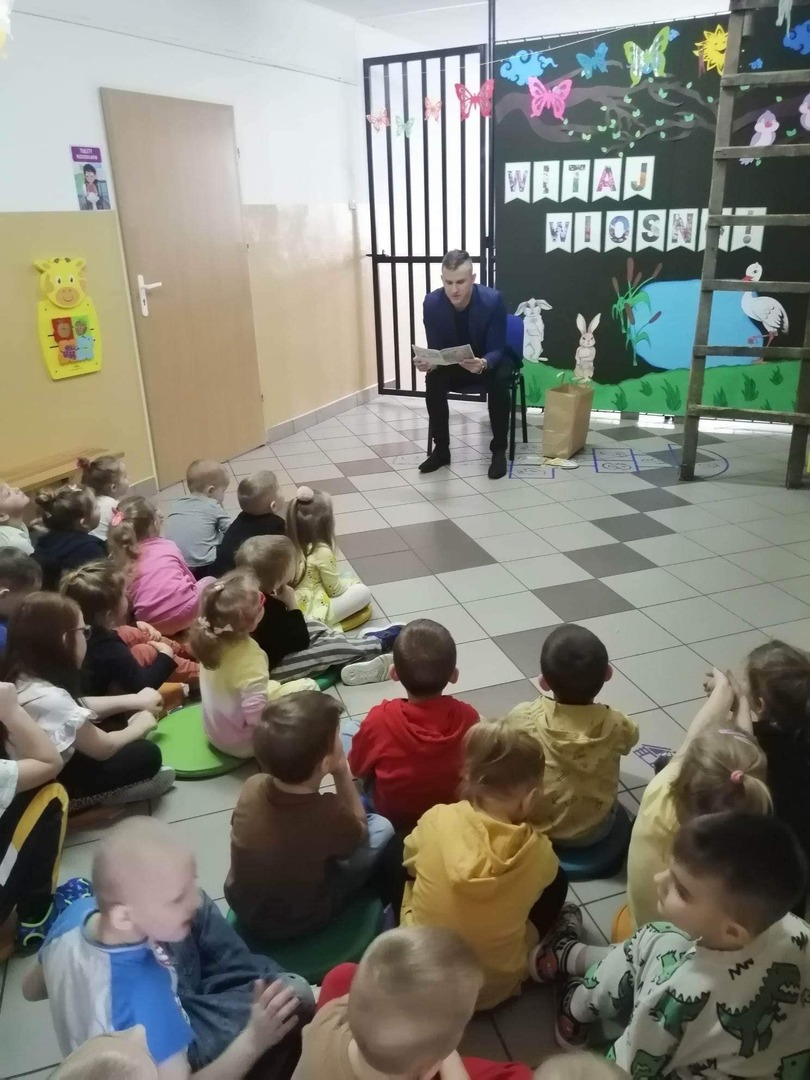 Przedświąteczne spotkanie w ramach akcji Przerośl czyta dzieciom, odbyło się 31 marca. Nasz uśmiechnięty gość, pan Rafał Lejmel, kierownik GOPS oraz opiekun w Domu Dziecka opowiedział o swojej pracy, a następnie przeczytał przedszkolakom książeczki o tematyce wielkanocnej. Po czytaniu i krótkiej rozmowie z dziećmi, pan Rafał podarował im jajka z niespodzianką. Nasze maluchy były bardzo zadowolone z tej miłej wizyty
