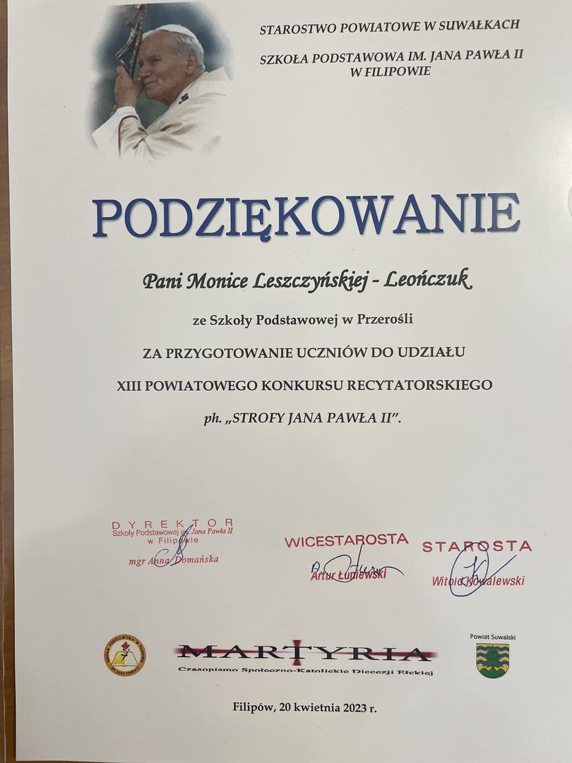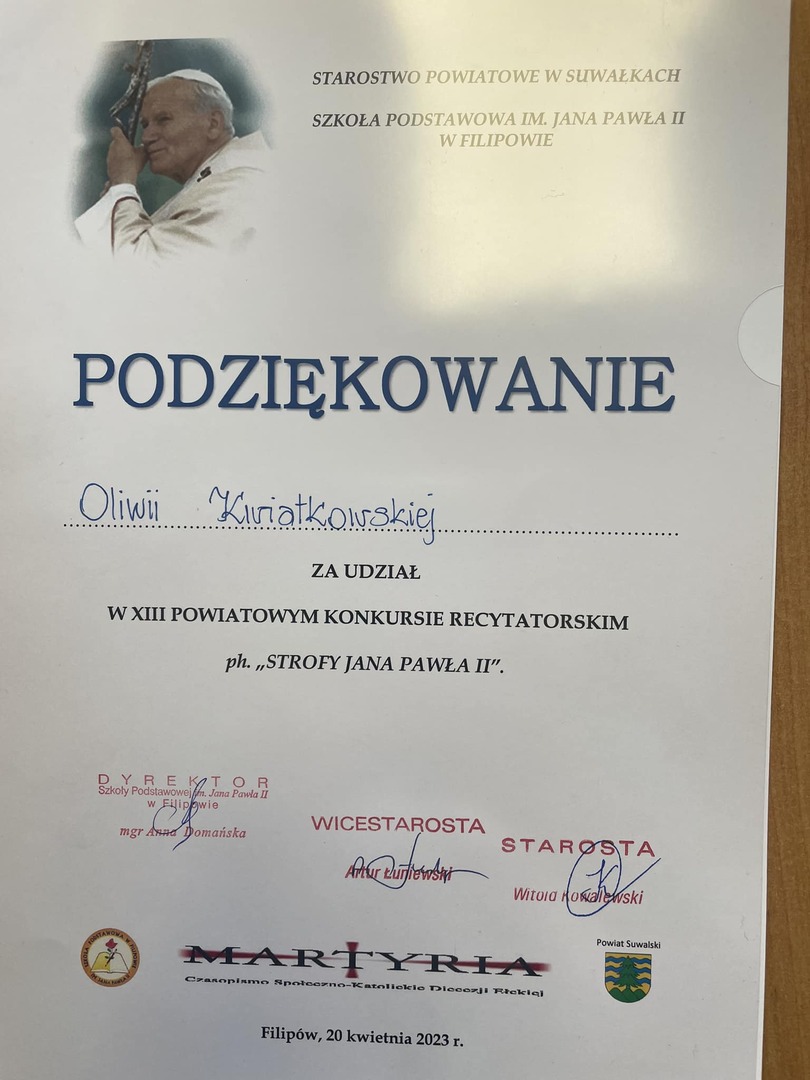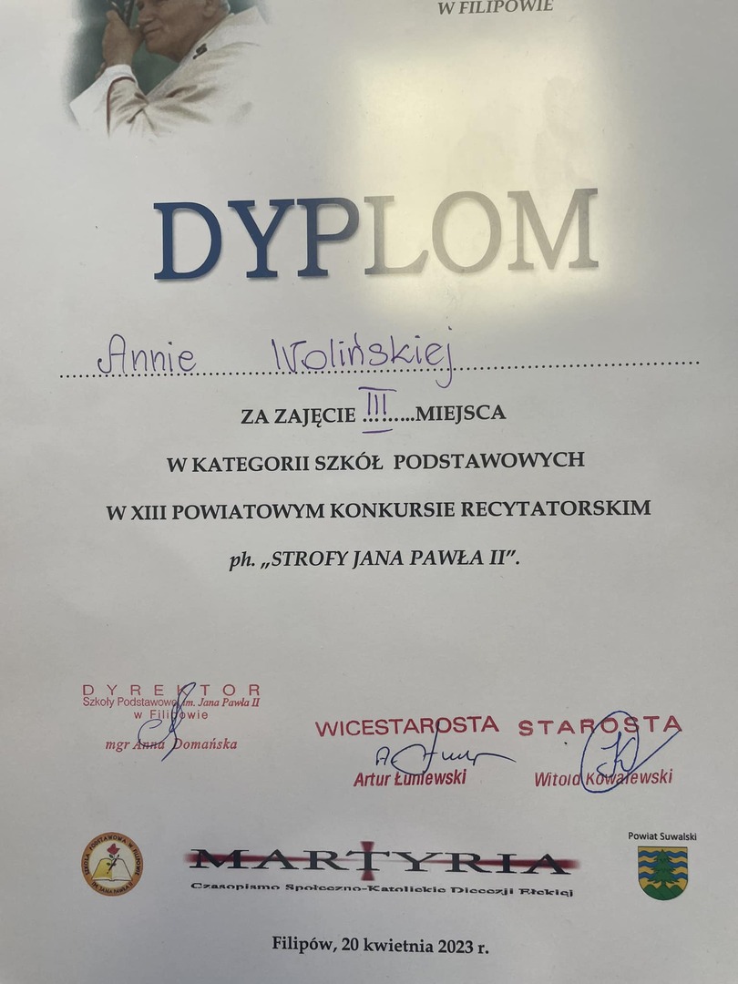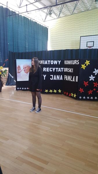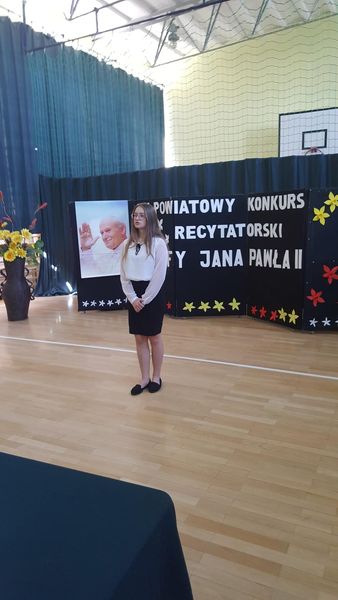 Strofy Jana Pawła II- nasza uczennica zdobyła trzecie miejsce w konkursie powiatowym