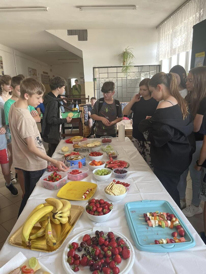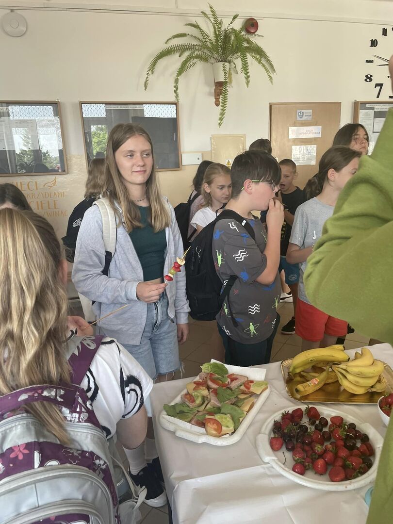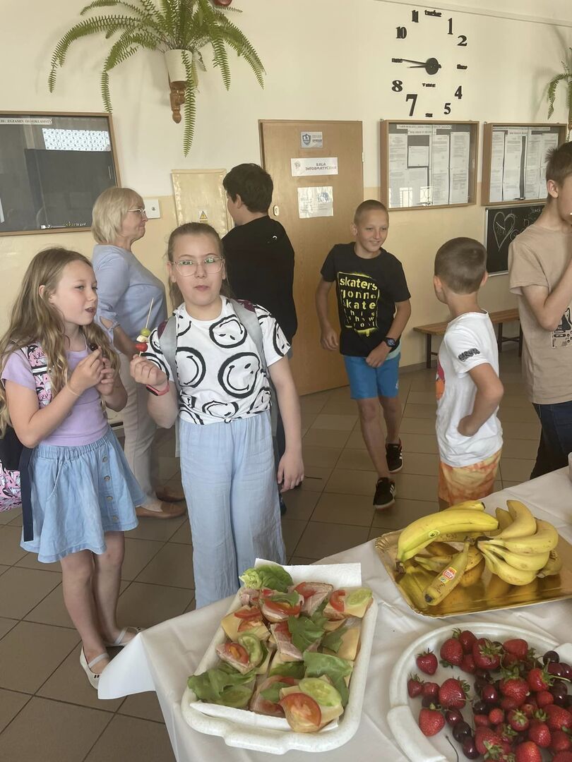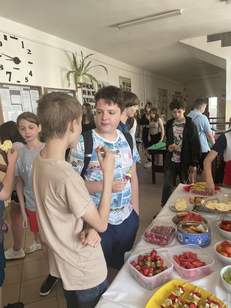 Jak mija Dzień Zdrowej Przekąski w naszej szkole w tak słoneczne przedpołudnie? Dziś stawiamy na owoce, warzywa, zdrowe tortille i kanapki. Są też zbożowe ciasteczka.Uczniowie i rodzice stanęli na wysokości zadania- przygotowali mnóstwo kolorowych i pysznych przekąsek. Przygotowane zostały też materiały dla uczniów o zdrowym stylu życia i o tym, na co należy uważać kupując produkty żywnościowe. (M.Leszczyńska-Leończuk)