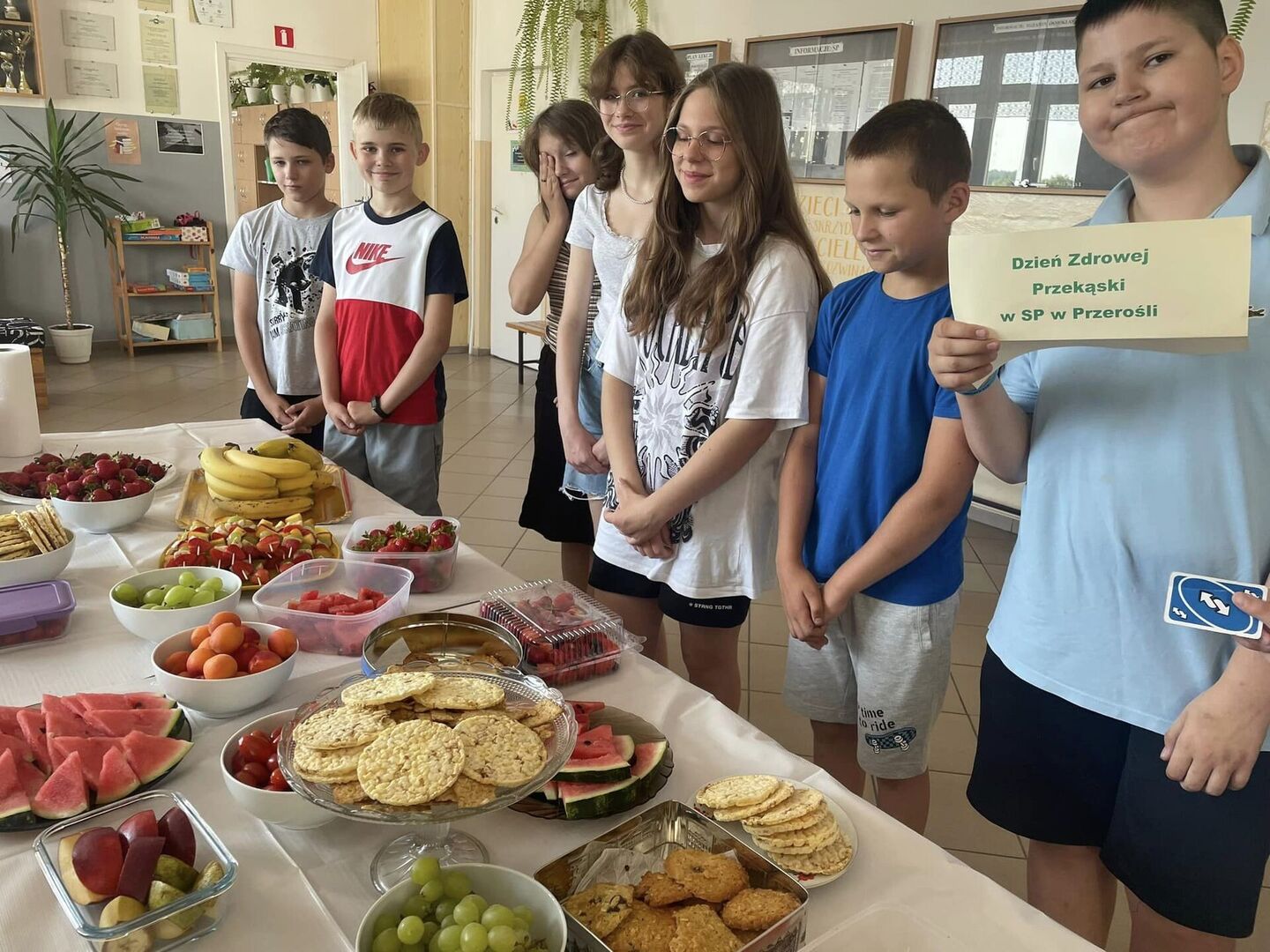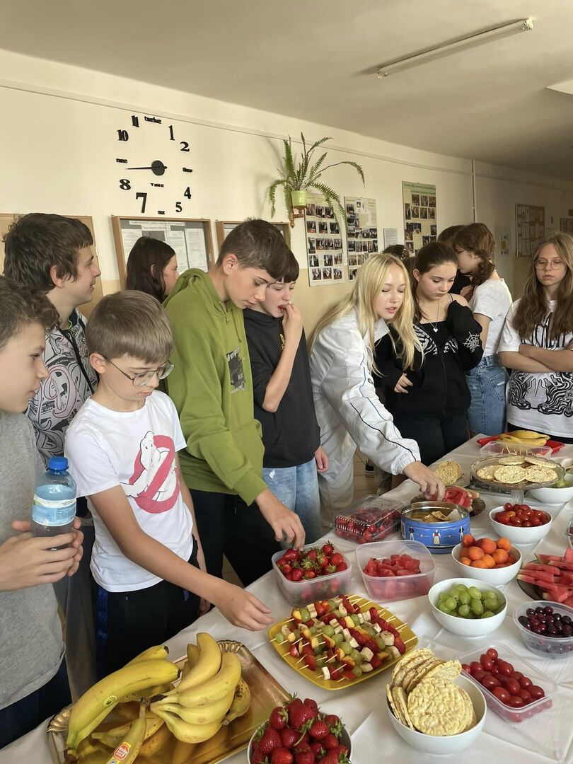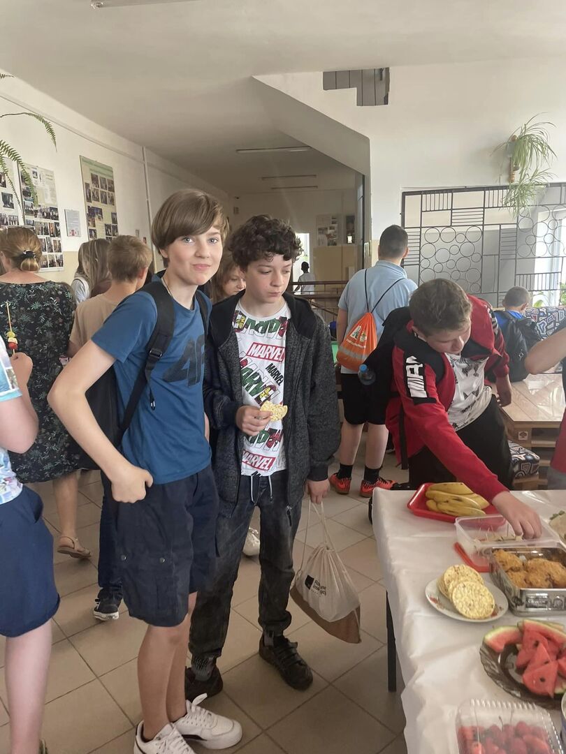 Jak mija Dzień Zdrowej Przekąski w naszej szkole w tak słoneczne przedpołudnie? Dziś stawiamy na owoce, warzywa, zdrowe tortille i kanapki. Są też zbożowe ciasteczka.Uczniowie i rodzice stanęli na wysokości zadania- przygotowali mnóstwo kolorowych i pysznych przekąsek. Przygotowane zostały też materiały dla uczniów o zdrowym stylu życia i o tym, na co należy uważać kupując produkty żywnościowe. (M.Leszczyńska-Leończuk)
