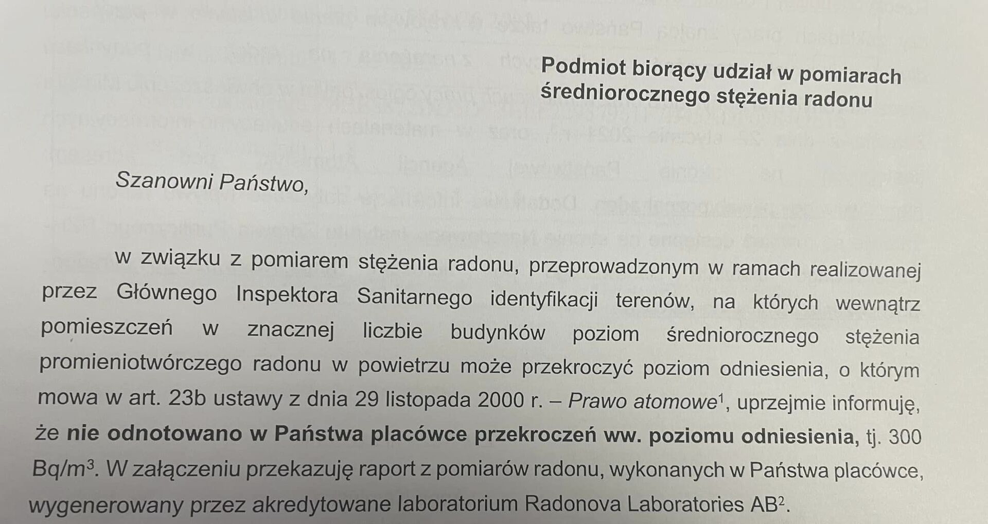 Oto wyniki pomiarów radonu przeprowadzonych w naszej szkole. Ten bezbarwny, bezzapachowy gaz o właściwościach radioaktywnych jest bardzo szkodliwym dla zdrowia pierwiastkiem powodującym nawet raka płuc. Wyniki pomiarów ukazują, że dzieci, ani nikt przebywający w szkole, nie jest narażony na jego działanie.