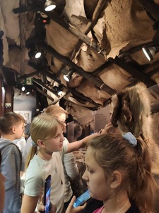 Uczniowie klasy IV i V naszej szkoły pod opieką I. Arciszewskiej, R. Dębowskiej i E. Zając uczestniczyli w lekcji muzealnej w Muzeum Okręgowym w Suwałkach. Czwartoklasiści twórczo spędzili czas wśród dzieł Alfreda Wierusza Kowalskiego. Poznali pojęcia związane ze sztuką, tajniki twórczości malarza oraz wcielili się w artystów tworzących obrazy. Starsi wysłuchali ciekawej opowieści o Jaćwingach, zobaczyli repliki pradziejowych strojów. Atrakcją zajęć było samodzielne wykonanie ozdób z miedzi poprzez naśladownictwo oryginalnych przedmiotów pochodzących z wykopalisk archeologicznych.
