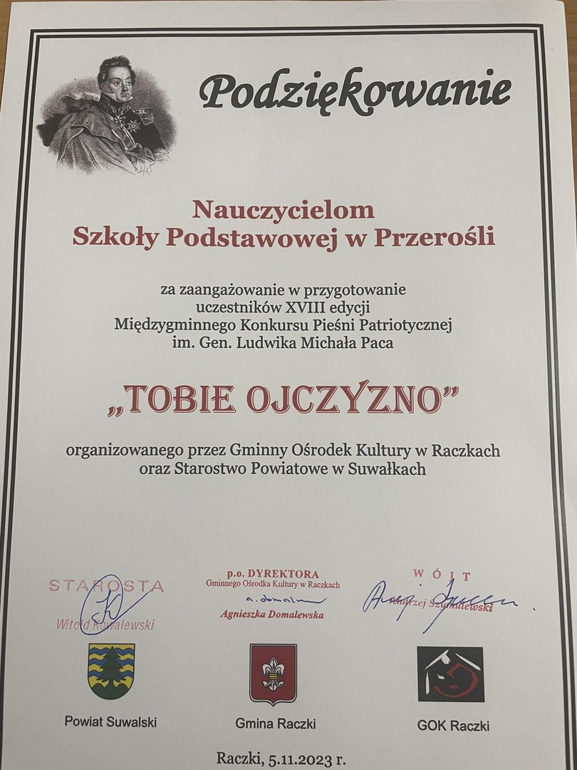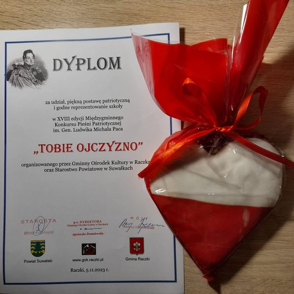 Dnia 05.11.2023r. w Raczkach odbył się Konkurs Pieśni Patriotycznej im. gen. Ludwika Paca „Tobie Ojczyzno 2023”. Organizatorem tego konkursu był Gminny Ośrodek Kultury w Raczkach we współpracy ze Starostwem Powiatowym w Suwałkach. Z naszej szkoły w konkursie udział wzięli: Nikola Pupel, Sandra Bordzio oraz Błażej Liszewski. Pięknie zaśpiewali przygotowane pieśni, zdobywając nowe doświadczenia i nowe znajomości. Cieszymy się, że reprezentowali naszą szkołę.Pani B. Buzie dziękujemy za przygotowanie, a rodzicom za dowiezienie dzieci do Raczek. Na zdjęciach, między innymi Inspektor ds. kultury i sportu, pani Barbara Cieśluk, dyrektor GOK w Raczkach, pani Agnieszka Domalewska.
