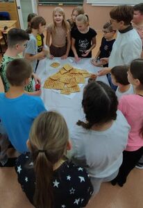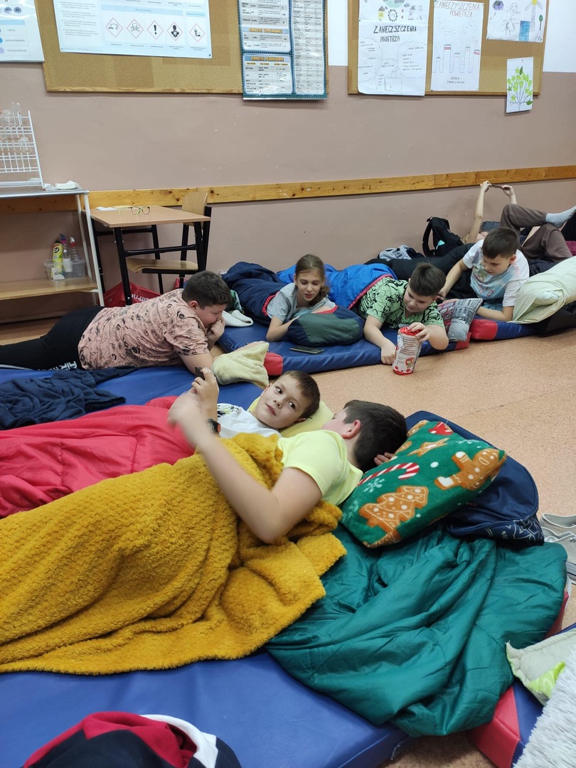W piątek 24 listopada uczniowie klasy V spędzili noc w szkole. Wydarzenie wywołało wiele emocji. W trakcie wspólnego wieczoru było pieczenie gofrów, powstało drzewo marzeń. Najwięcej radości dzieciom dostarczyły wspólne zabawy na korytarzu. Kiedy emocje trochę opadły i zmęczenie dało o sobie znać przyszedł czas na odpoczynek i długie rozmowy, które cichły bardzo powoli. W sobotę rano wszyscy jednogłośnie stwierdzili, że najważniejsze było wspólne spędzenie czasu z rówieśnikami.