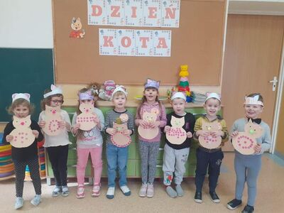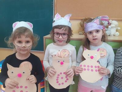 "Szare, bure lub pstrokate, wszystkie koty za pan brat". Motyw z bajki "Przygody Kota Filemona" świetnie wpisał się w Dzień Kota . Tego dnia przedszkolaki weszły do sal w kocich barwach oraz makijażach. Dzieci z zainteresowaniem wysłuchały ciekawostek o kociakach oraz wzięły udział w różnych grach i zabawach.