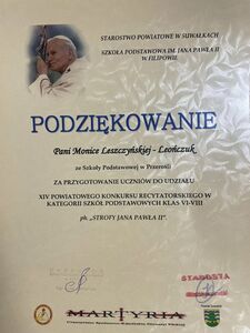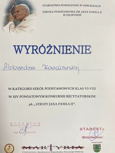 25 kwietnia odbył się Powiatowy Konkurs Recytatorski „Strofy Jana Pawła II” w Filipowie. Nasze trzy uczennice wzięły w nim udział i wróciły z ciekawymi nagrodami. Aleksandra Kowalewska z kl. VI otrzymała wyróżnienie, natomiast Natalia Podbielska i Martyna Czostek podziękowania za udział. Dziewczynkami opiekowała się w czasie konkursu pani B. Buza, do recytacji przygotowała p. M. Leszczyńska-Leończuk.