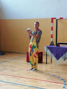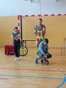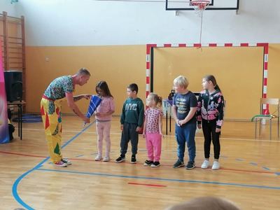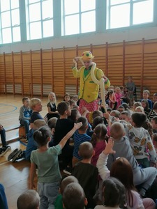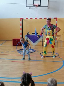 4 października nasza sala gimnastyczna zamieniła się w arenę cyrkową. Zawitali do nas artyści z cyrku "SZOK" ze swoim programem artystycznym. Wszyscy z zachwytem śledzili poczynania cyrkowców. Zobaczyć można było: akrobacje, iluzje, występ Superbohatera, ogromnego pomarańczowego stworka oraz misia polarnego, jazdę na rowerku jednokołowym. Był także gość specjalny - wąż, którego dzieci mogły dotknąć. Artyści zaprosili do wspólnych występów zgromadzone dzieci, które pełne radości z różnym skutkiem próbowały dotrzymać kroku cyrkowcom.