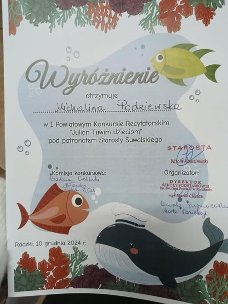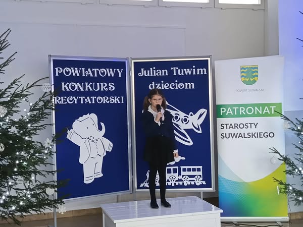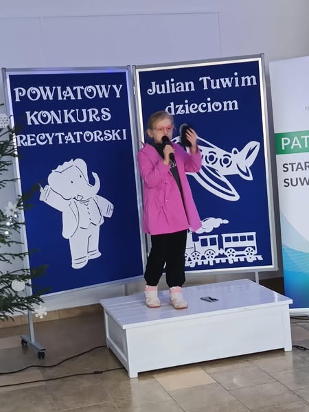 10 grudnia 2024 r. trzy uczennice z klas l-lll wzięły udział w powiatowym konkursie recytatorskim pt. "Julian Tuwim dzieciom". Michalina Podziewska oczarowała jury interpretacją wiersza pt. ,,Zosia Samosia", za co otrzymała wyróżnienie. Wszystkim uczestnikom konkursu serdecznie gratulujemy!