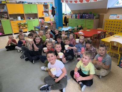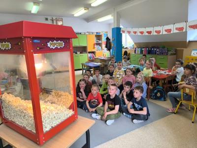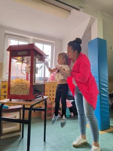 Dziś przedszkolaków spotkała miła niespodzianka. Dzieci miały okazję zjeść popcorn zrobiony w prawdziwej maszynie i obejrzeć bajkę. Przez chwilę poczuliśmy się jak w kinie. Dzieciom popcorn bardzo smakował i wielu z nich chciało dokładkę. Wszyscy wyszli dziś z przedszkola z pełnym brzuchem i uśmiechniętą buzią.