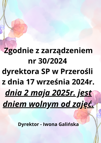 23 kwietnia 2025 Aktualności 2 maja 2025r.dzień wolny od pracy w SP w Przerośli W dniu 2 maja 2025r. Szkoła Podstawowa w Przerośli będzie nieczynna. ... Czytaj więcej